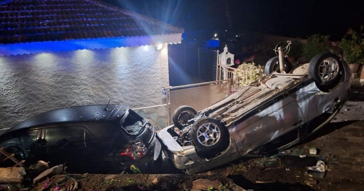 Το όχημα που προσγειώθηκε ανάποδα μπροστά από το σπίτι φαίνεται να προκάλεσε ζημιές και σε σταθμευμένο όχημα.