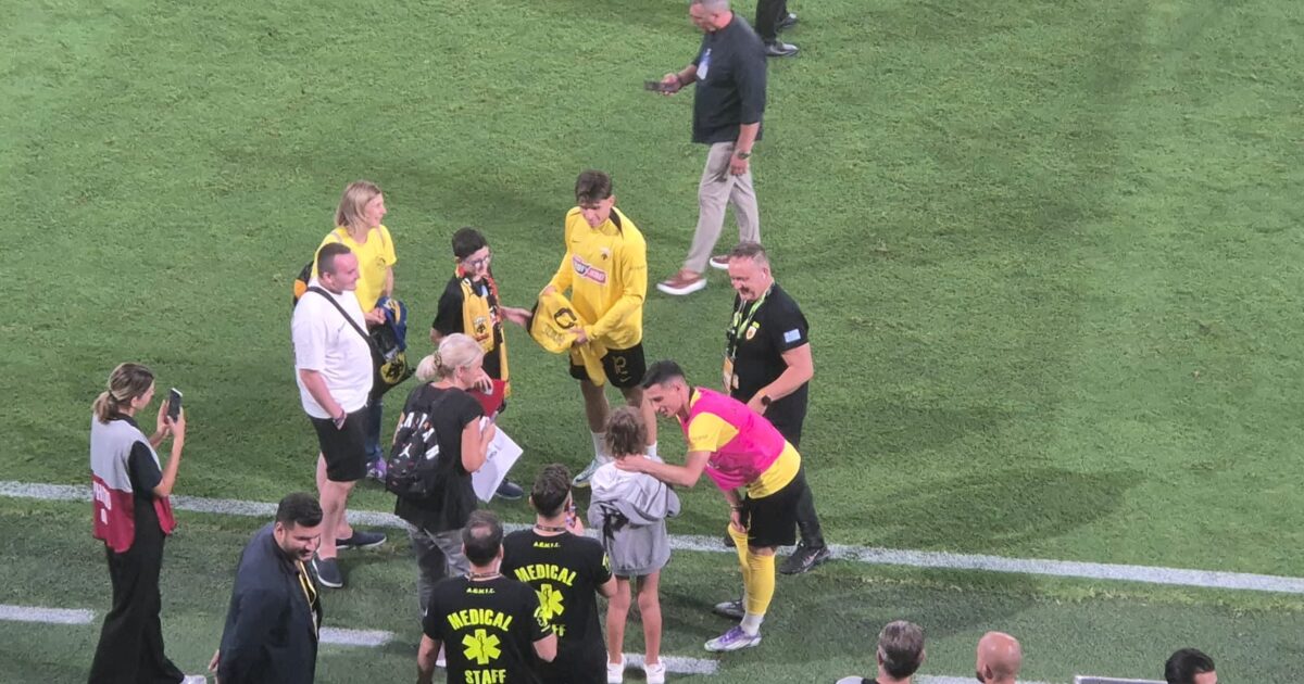 Ο πιτσιρικάς Ενωσίτης κατέβηκε, μάλιστα, στον αγωνιστικό χώρο μετά το τέλος του αγώνα, φορώντας φανέλα και κασκόλ της ΑΕΚ, ώστε να βγάλει φωτογραφίες με παίκτες της αγαπημένης του ομάδας, όπως με τον Βίντα. Πήρε, μάλιστα, και τη φανέλα του διεθνή Κύπριου στόπερ των Αγρινιωτών, Χρίστου Σιέλη.