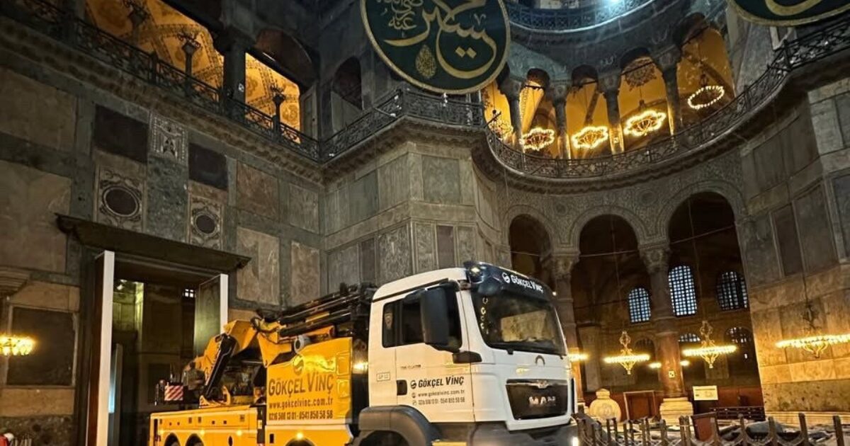 Η εμφάνιση βαρέων γερανοφόρων φορτηγών μέσα στην Αγία Σοφία προκαλεί ανησυχίες σχετικά με τον τρόπο που πραγματοποιείται η τελευταία φάση των εργασιών αποκατάστασης, τόσο σε μέσα της Ελλάδας, αλλά και στην Τουρκία.