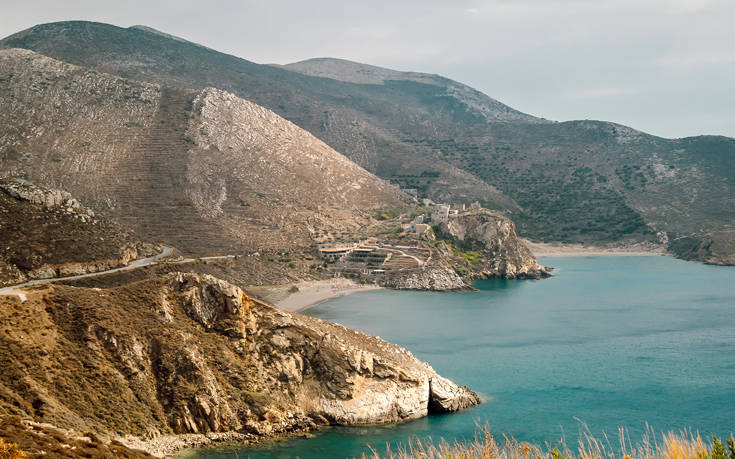 Οι πέτρινες κατοικίες του μικρού οικισμού Μαρμάρι γίνονται ένα με το άγριο, φυσικό τοπίο ολόγυρά τους, με την μοναδική χρωματιστή πινελιά τα νερά της θάλασσας που αγγίζουν την αμμουδερή ακρογιαλιά του οικισμού.