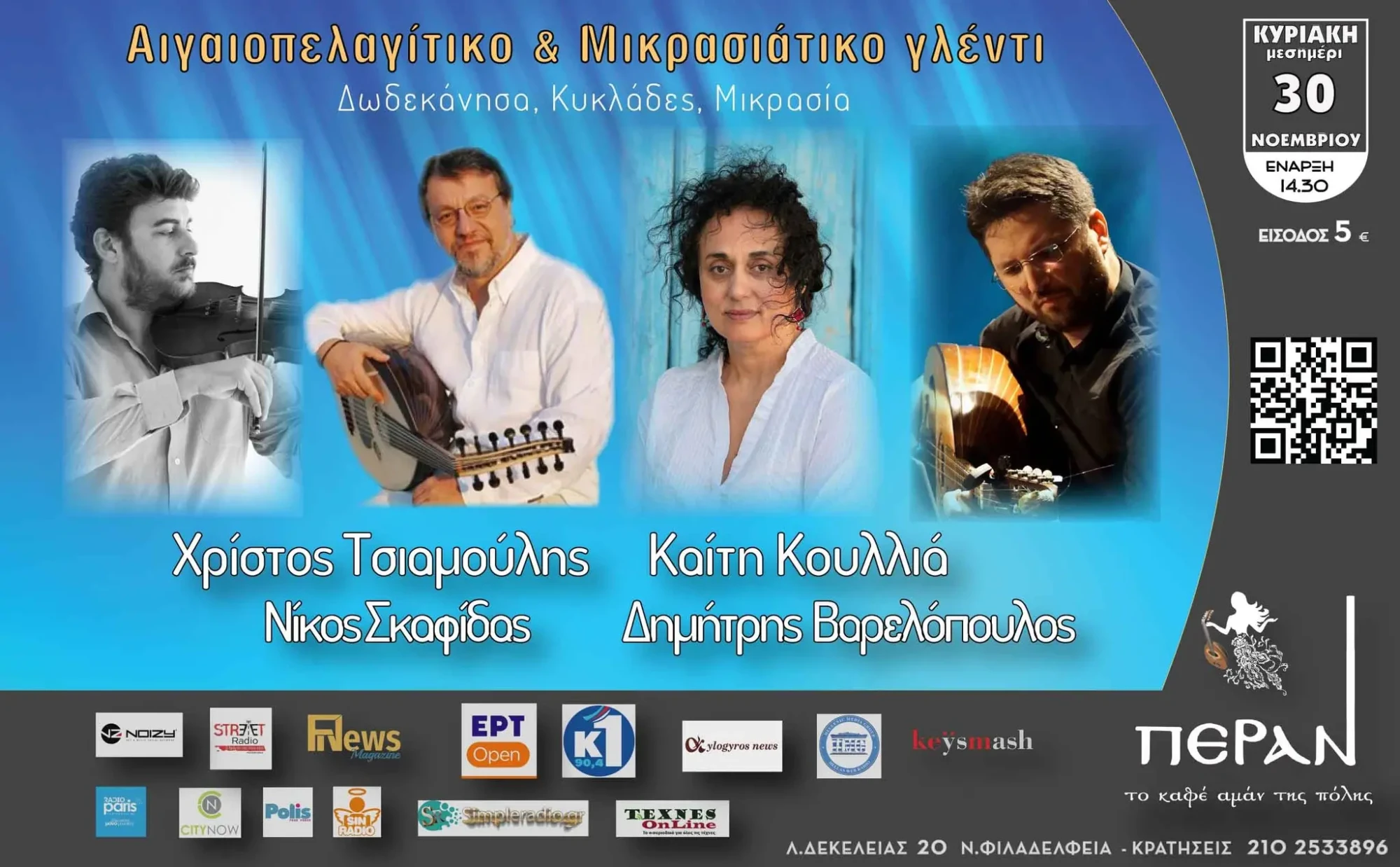 Την Κυριακή 30 Νοεμβρίου στις 14.30, το «Πέραν, το καφέ αμάν της πόλης» μας προσκαλεί να γίνουμε θαλασσινοί συνταξιδιώτες του σε μια μελωδική περιδιάβαση από την Κωνσταντινούπολη και τη Μικρά Ασία ως τα αιγαιοπελαγίτικα νησιά και να γλεντήσουμε παρέα με τον Χρίστο Τσιαμούλη ( ούτι-φωνή), την Καίτη Κουλλιά, τον Νίκο Σκαφίδα (βιολί) και τον Δημήτρη Βαρελόπουλο (λαούτο).
