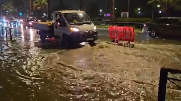 Η δεξιά λωρίδα της Λεωφόρου Ποσειδώνος έχει γεμίσει νερά και το όχημα της ΕΥΔΑΠ, που κρατάει με την ρόδα κλειστό το φρεάτιο, διακόπτει την κυκλοφορία.