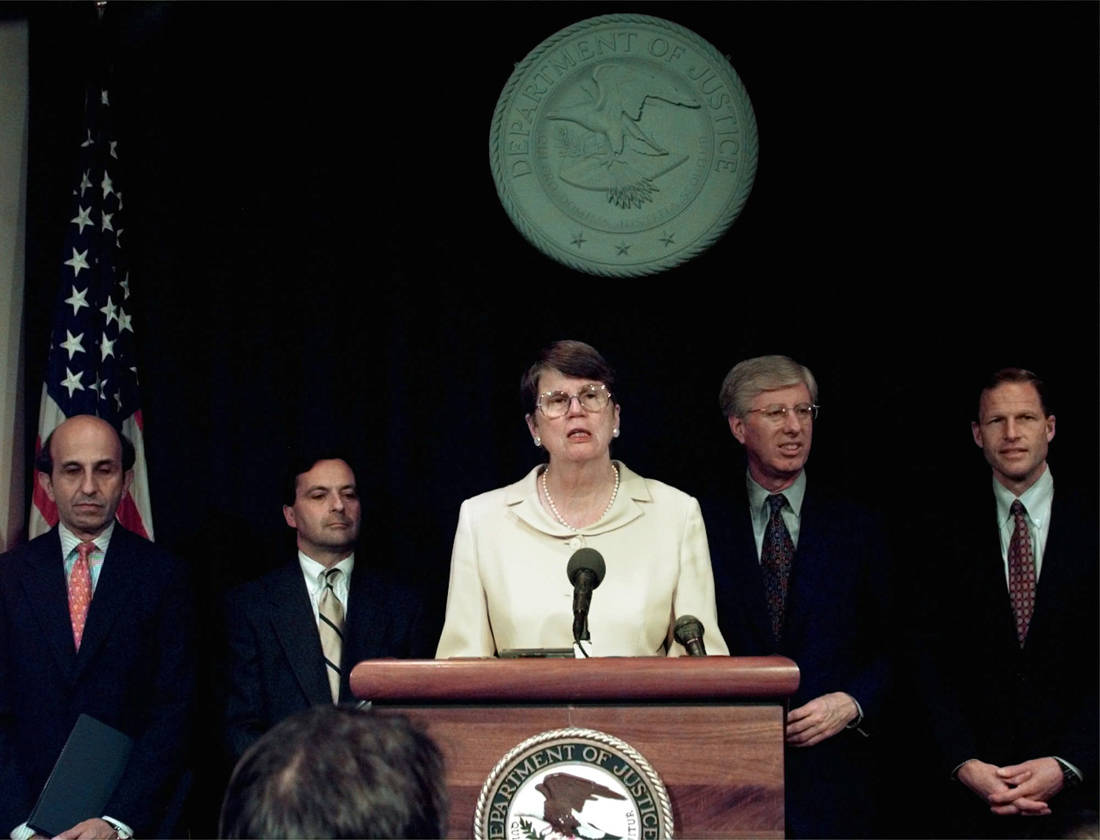 Στην πολυαναμενόμενη συνέντευξη Τύπου εκείνης της 18ης Μαΐου 1998, η γενική εισαγγελέας Janet Reno κατηγόρησε τη Microsoft ότι είχε «χρησιμοποιήσει τη μονοπωλιακή της δύναμη ώστε να αναπτύξει μια θηλιά που έπνιγε το λογισμικό περιήγησης που ήταν απαραίτητο για την πρόσβαση στο ίντερνετ».