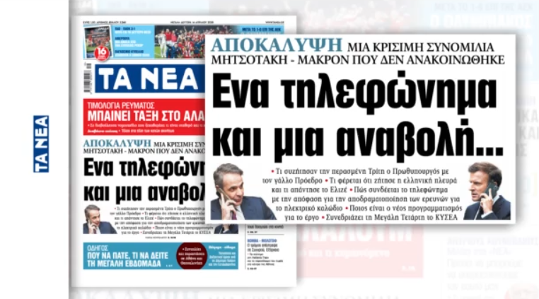 Η εφημερίδα «Τα Νέα» αποκάλυψε πως ο Κυριάκος Μητσοτάκης και ο Εμμανουέλ Μακρόν είχαν μια κρίσιμη τηλεφωνική συνομιλία που δεν ανακοίνωσαν ούτε το Ελιζέ ούτε και το πρωθυπουργικό γραφείο.