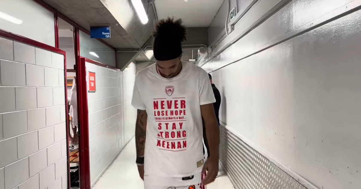 Οι παίκτες του Ολυμπιακού στην προθέρμανση του αγώνα με την Αρμάνι Μιλάνο φόρεσαν μπλουζάκια με το μήνυμα «ποτέ μην χάνεις την ελπίδα σου, πάντα υπάρχει τρόπος. Να είσαι δυνατός Κίναν Έβανς» για να στηρίξουν τον Αμερικανό γκαρντ μετά το νέο τραυματισμό του.