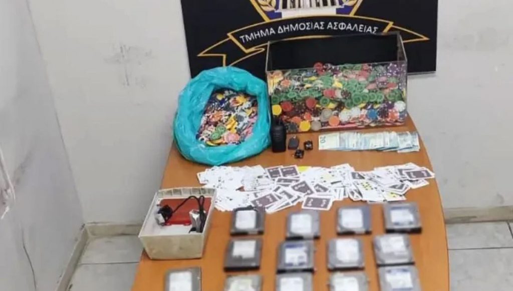 Κατά τον έλεγχο βρέθηκαν 4 παιχνιδομηχανές, ηλεκτρονική ρουλέτα, ειδικά διαμορφωμένα τραπέζια για τη διενέργεια των τυχερών παιγνίων, μηχάνημα ανίχνευσης πλαστών χαρτονομισμάτων, δύο ασύρματοι, 41 σκληροί δίσκοι, 34 οθόνες και 28 κεντρικές μονάδες ηλεκτρονικών υπολογιστών, τραπουλόχαρτα και μάρκες.