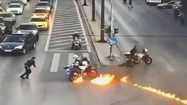 Την στιγμή της επίθεσης σε βάρος αστυνομικών, προς τους οποίους άγνωστοι πέταξαν βόμβες μολότοφ στο τέλος της πορείας για την Παλαιστίνη το απόγευμα της Κυριακής, κατέγραψε κάμερα ασφαλείας.