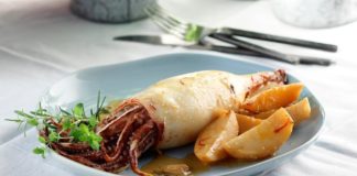 Καλαμαράκια «γεμιστά» με αρωματικά, ψητά στο φούρνο με πατάτες