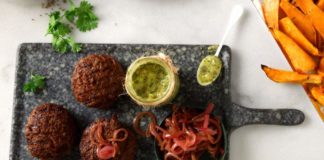 Μπιφτέκια αφράτα με καραμελωμένα κρεμμύδια και γλυκοπατάτες