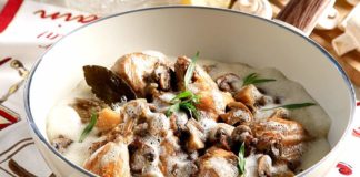 Κοτόπουλο φρικασέ με σελινόριζα και μανιτάρια