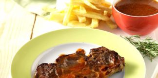 Μπριζολάκια με γλυκό κρασί, σπιτική κέτσαπ και πατάτες με μπέικον
