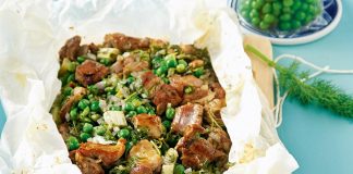 Αρνί ξεκοκαλισμένο στη λαδόκολλα με αρακά