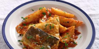 Βακαλάος αγιορείτικος με πατάτες και κόκκινη σάλτσα