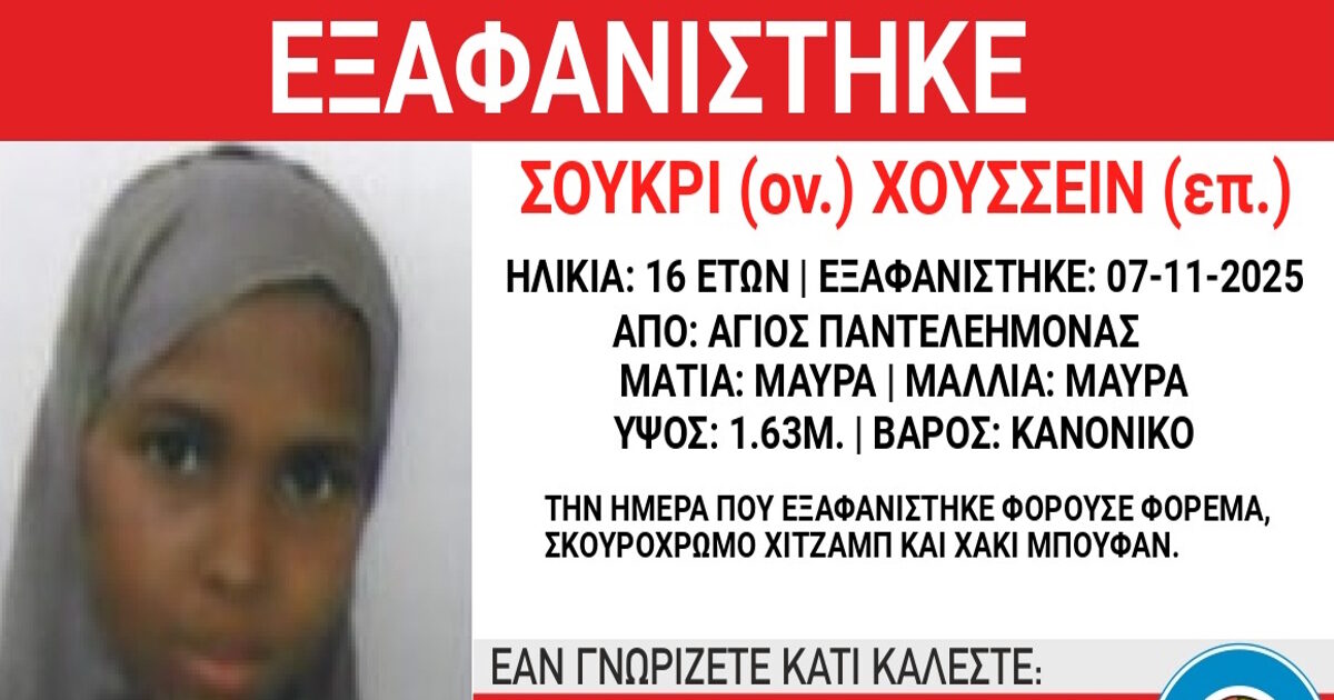 Η 16χρονη, Σούκρι Χουσσεΐν, εξαφανίστηκε το απόγευμα της 7ης Νοεμβρίου 2025 και το «Χαμόγελο του Παιδιού» ενημερώθηκε σήμερα, 13/11/2025, για την εξαφάνιση και προχώρησε άμεσα στη δημοσιοποίηση των στοιχείων της ανήλικης, καθώς ενδέχεται να συντρέχουν λόγοι που θέτουν τη ζωή της σε κίνδυνο.