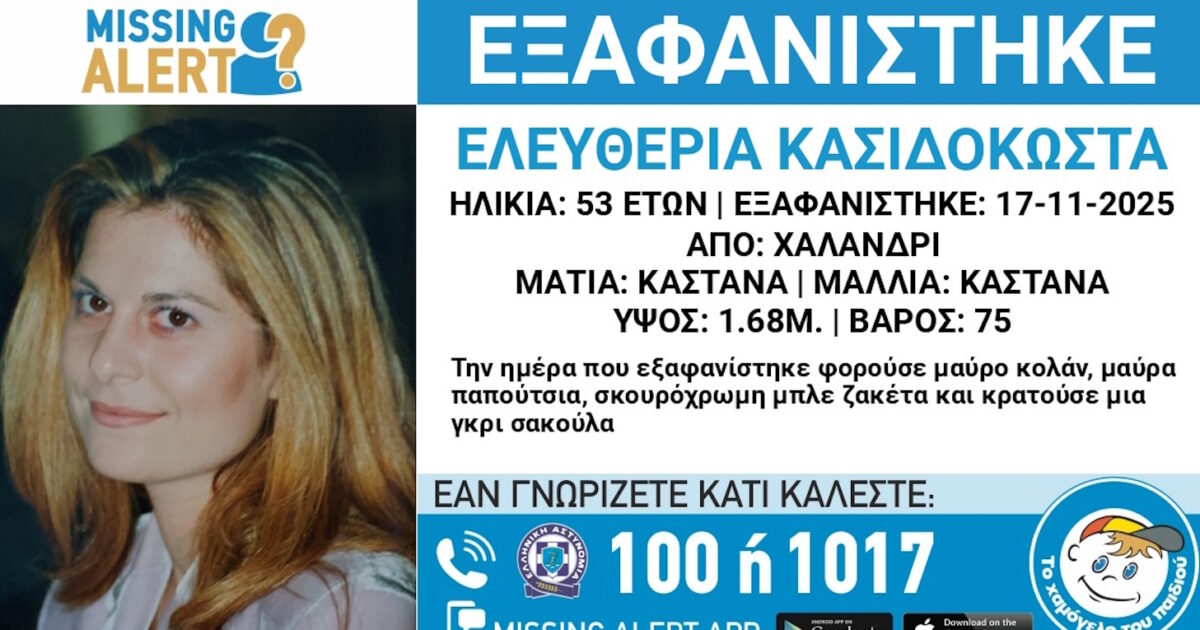 Συναγερμός έχει σημάνει στο «Χαμόγελο του Παιδιού» για την εξαφάνιση της Ελευθερίας Κασιδόκωστα από την περιοχή του Χαλανδρίου.
