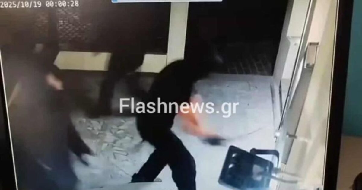 Όπως φαίνεται στο βίντεο, οι δράστες, κρατώντας αντικείμενα στα χέρια σπάνε και διαλύουν το ΑΤΜ.