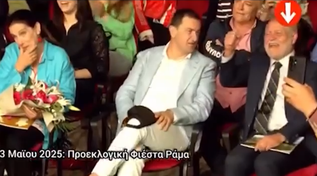 Ο Έντι Ράμα εκφωνεί λόγο στην πολύκροτη συναυλία του Χρήστου Μάστορα στη Χειμάρρα. Μιλά στα ελληνικά και από κάτω, στις θέσεις των επισήμων, βρίσκεται ο δήμαρχος της βόρειας Κέρκυρας.