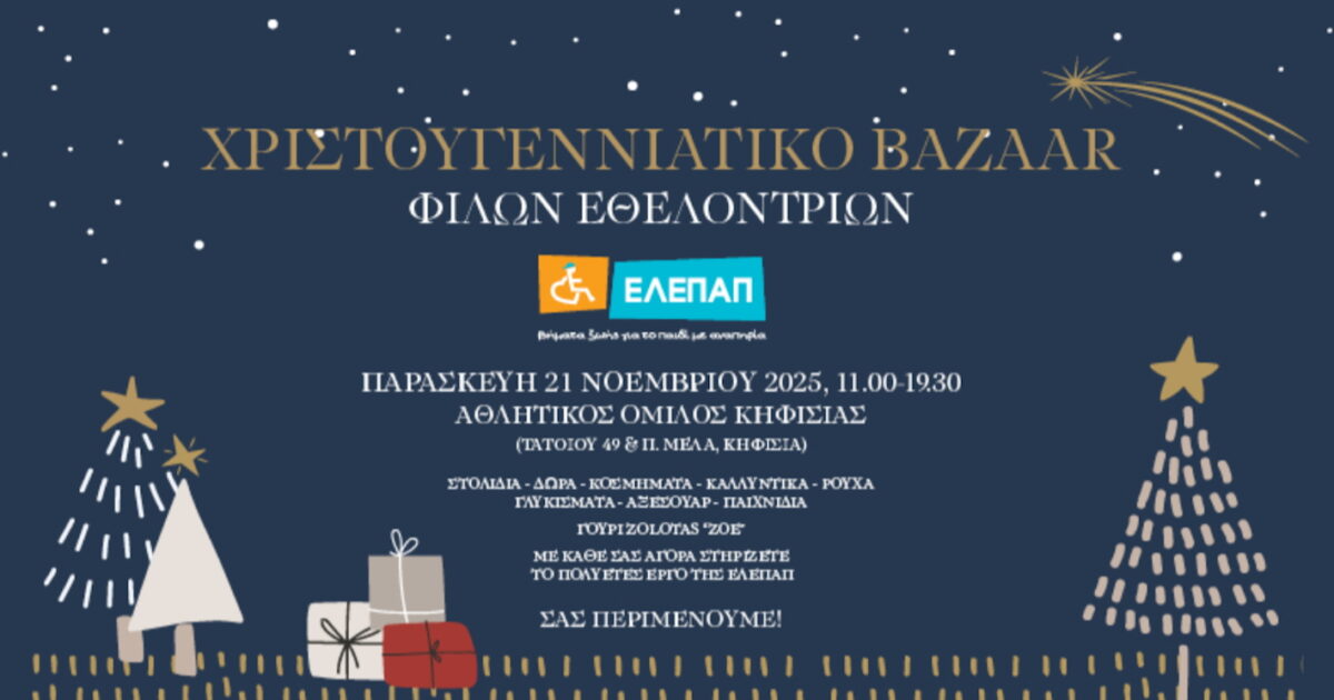 Οι Φίλες Εθελόντριες της ΕΛΕΠΑΠ σας προσκαλούν στο καθιερωμένο Χριστουγεννιάτικο Bazaar που διοργανώνουν την Παρασκευή 21 Νοεμβρίου 2025, από τις 11:00 το πρωί μέχρι τις 19:30 το απόγευμα, στον Αθλητικό Όμιλο Κηφισιάς (Τατοΐου 49 & Π. Μελά, Κηφισιά).