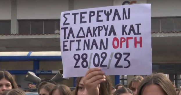 Η πορεία για το δυστύχημα στα Τέμπη κατέληξε στον σταθμό των τρένων, εκεί που υπάρχει ένα μνημείο με ένα ρολόι σταματημένο την ώρα του δυστυχήματος.