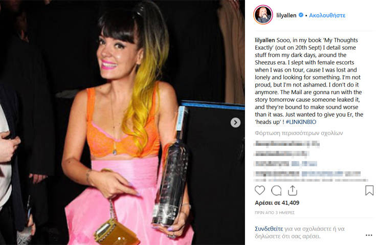 Η διάσημη τραγουδίστρια, μέσα από μία ανάρτησή της, στο Instagram παραδέχεται ότι στη διάρκεια της περιοδείας της, το 2014 πλήρωνε γυναίκες συνοδούς πολυτελείας για να κάνουν σεξ μαζί της, επειδή την περίοδο εκείνη ένιωθε «μόνη και χαμένη». Ο λόγος για την Λίλι Άλεν, η αποκάλυψη της οποίας προκάλεσε – όπως ήταν αναμενόμενο – σάλο.