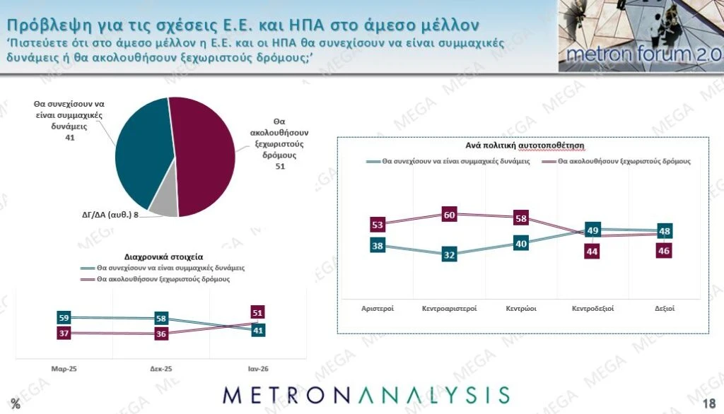 Τέλος, ως προς τα διεθνή ζητήματα, το 51% θεωρεί πως ΕΕ και ΗΠΑ θα ακολουθήσουν στο άμεσο μέλλον ξεχωριστούς δρόμους, ενώ το 41% πως θα παραμείνουν συμμαχικές δυνάμεις.