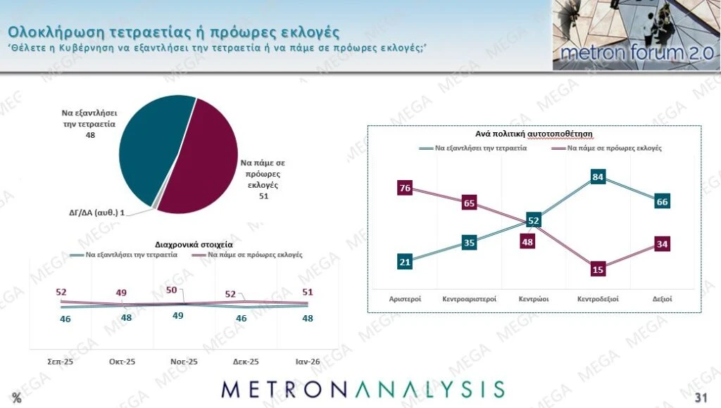 Στην ερώτηση «Θέλετε η Κυβέρνηση να εξαντλήσει την τετραετία ή να πάμε σε πρόωρες εκλογές;» οι πολίτες εμφανίζονται διχασμένοι, καθώς το 48% ζητά να εξαντληθεί η τετραετία, ενώ το 51% θέλει πρόωρες εκλογές.