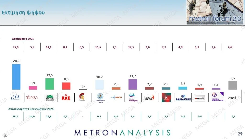 Υπερδιπλάσια διαφορά τόσο στην πρόθεση όσο και στην εκτίμηση ψήφου διατηρεί η Νέα Δημοκρατία από το δεύτερο ΠΑΣΟΚ στη νέα δημοσκόπηση της Metron Analysis για το MEGA.