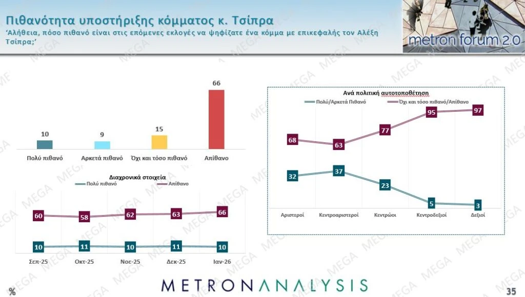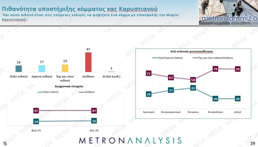 Στην υποθετική ερώτηση που αφορά το κόμμα Καρυστιανού, το 33% δηλώνει πως είναι πολύ ή αρκετά πιθανό να το ψηφίσει.