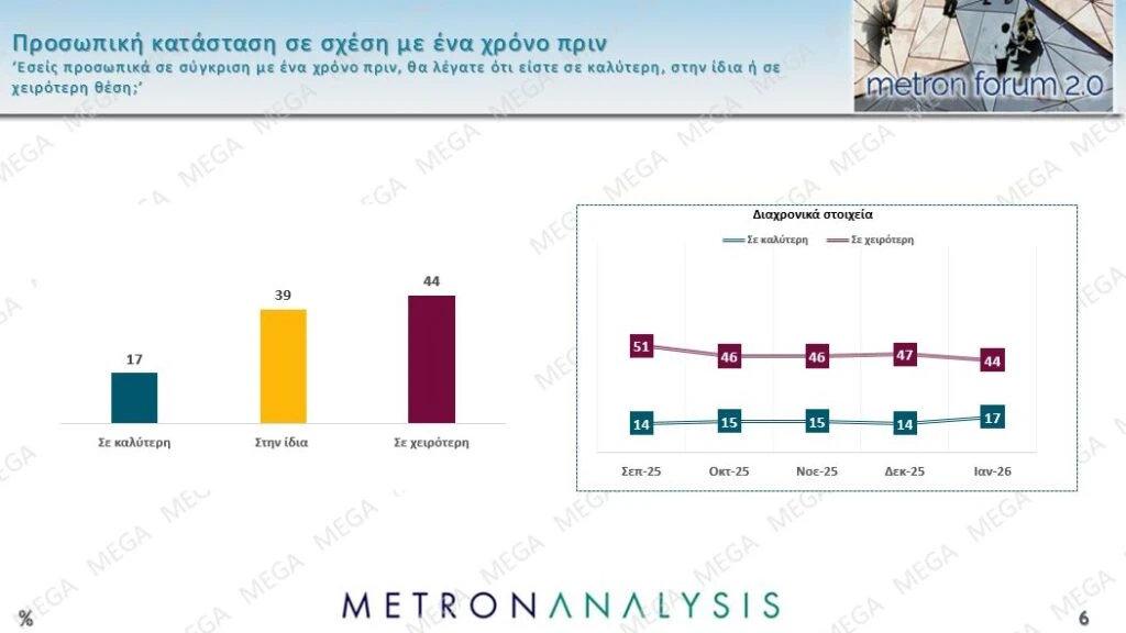 Στην ερώτηση «Εσείς προσωπικά σε σύγκριση με ένα χρόνο πριν, θα λέγατε ότι είστε σε καλύτερη, στην ίδια ή σε χειρότερη θέση;» το 44% απάντηση ότι βρίσκεται σε χειρότερη κατάσταση, το 39% στην ίδια και το 17% σε καλύτερη.