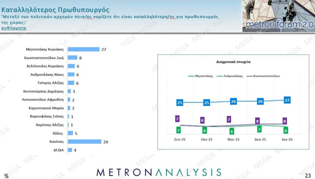 Καταλληλότερος πρωθυπουργός είναι ο Κυριάκος Μητσοτάκης με 27%, καθώς τον περνάει μόνο ο «Κανένας» που βρίσκεται στο 29%. Ακολουθεί με μεγάλη διαφορά η Ζωή Κωνσταντοπούλου με 8%, ενώ οι Νίκος Ανδρουλάκης, Αλέξης Τσίπρας και Κυριάκος Βελόπουλος παίρνουν από 6%.