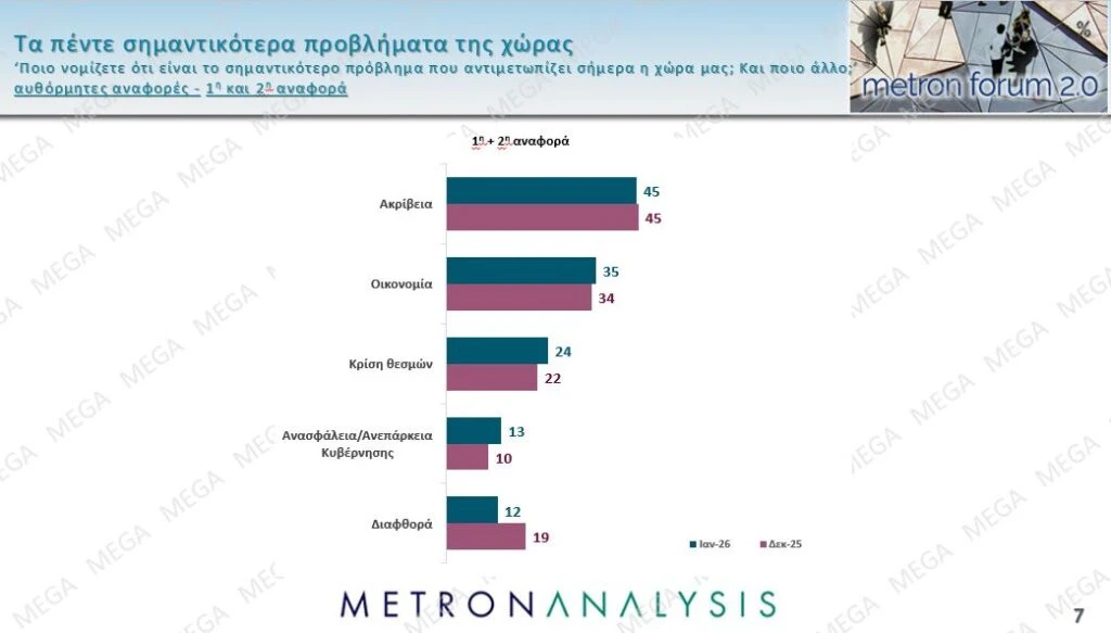 Περνώντας στο κοινωνικά ζητήματα, στην ερώτηση «Ποιο νομίζετε ότι είναι το σημαντικότερο πρόβλημα που αντιμετωπίζει σήμερα η χώρα μας; Και ποιο άλλο;» το ζήτημα της ακρίβειας είναι στην πρώτη θέση με 45% των ερωτηθέντων να το απαντούν ως πρώτα και ένα ίδιο ποσοστό ως δεύτερο.