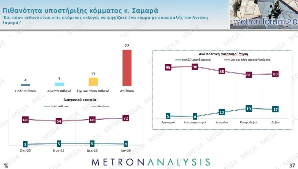 Στην ίδια ερώτηση, το 11% δηλώνει ότι είναι πολύ ή αρκετά πιθανό να ψήφιζε ένα κόμμα Σαμαρά.