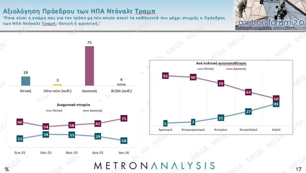 Ακόμη, το 75% των ερωτηθέντων έχει αρνητική γνώμη για τον Αμερικανό πρόεδρο, Ντόναλντ Τραμπ, ενώ μόλις το 18% θετική.