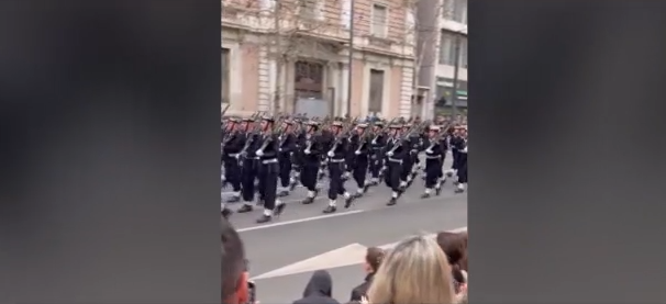 Το τμήμα της Σχολής Μονίμων Υπαξιωματικών Ναυτικού, της ΣΜΥΝ, περνάει μπροστά από πολίτες που έχουν συγκεντρωθεί μετά το Σύνταγμα και την ολοκλήρωση της παρέλασης και φωνάζει το σύνθημα. Οι πολίτες χειροκροτούν.