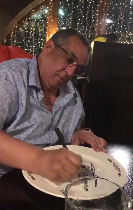 Όχι μόνο λοιπόν κατάφερε να δειπνήσει στο εστιατόριο, αλλά το προσωπικό του ζήτησε να υπογράψει σε ένα πιάτο, όπως δείχνει και το βίντεο.