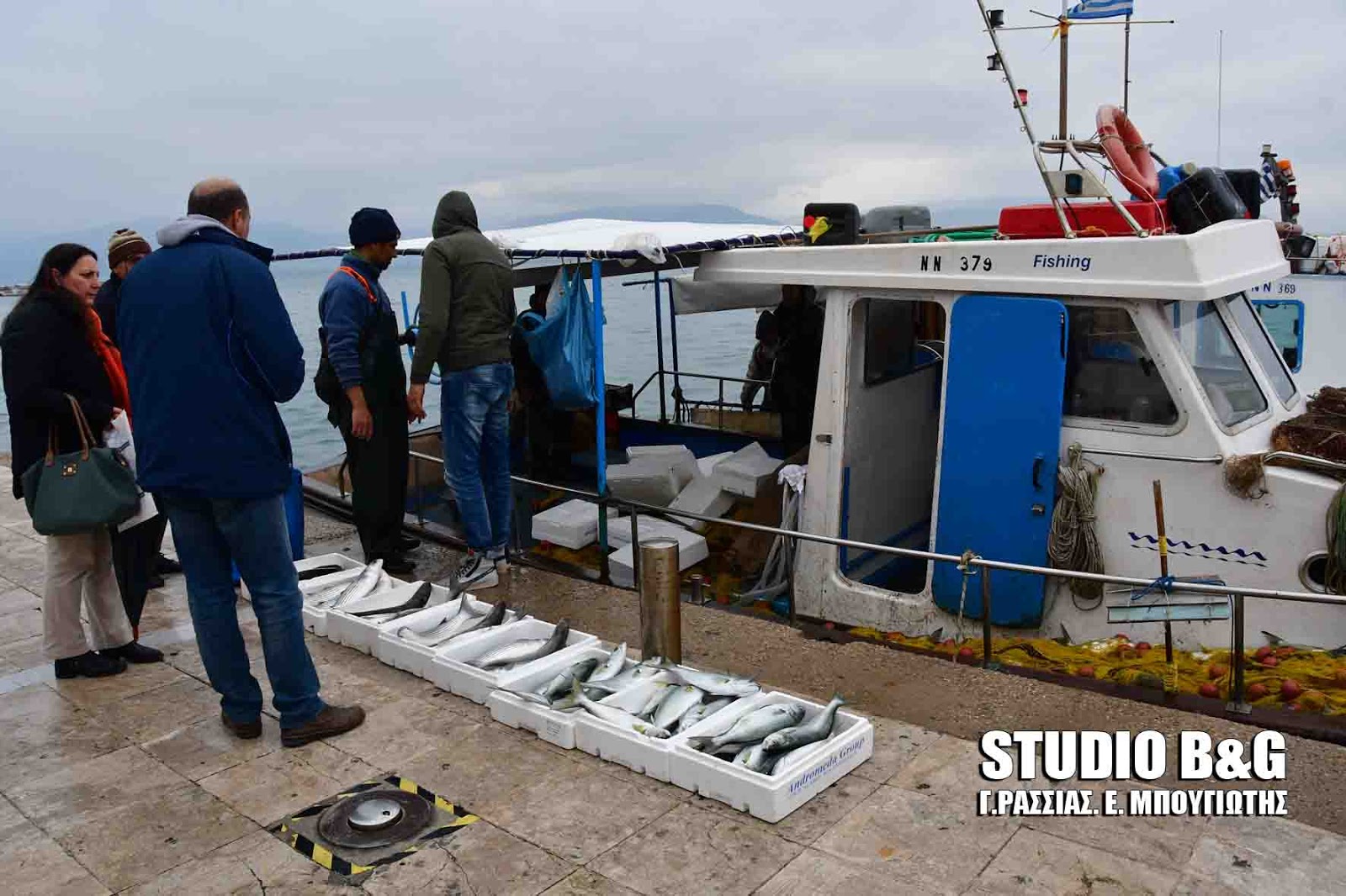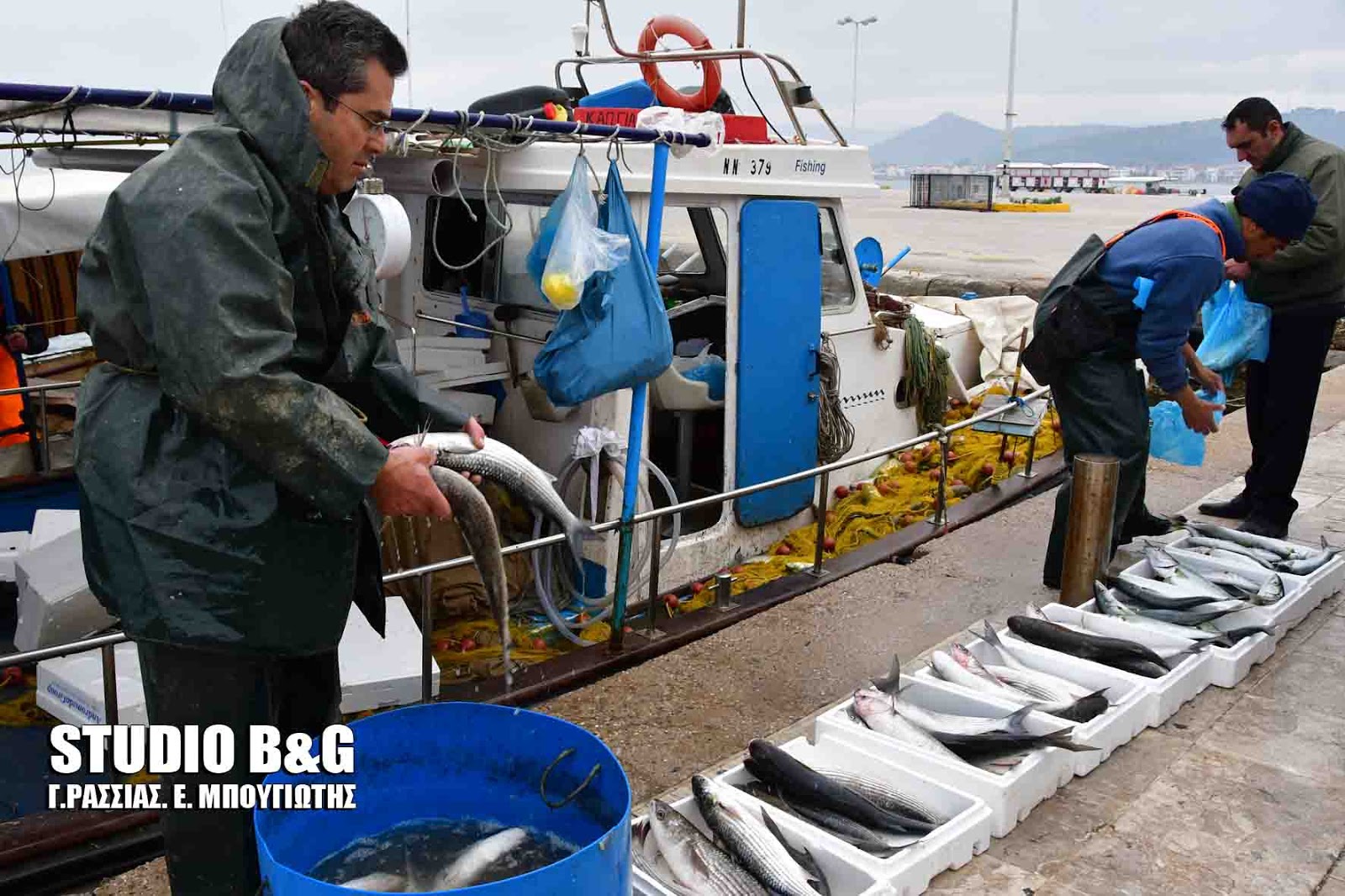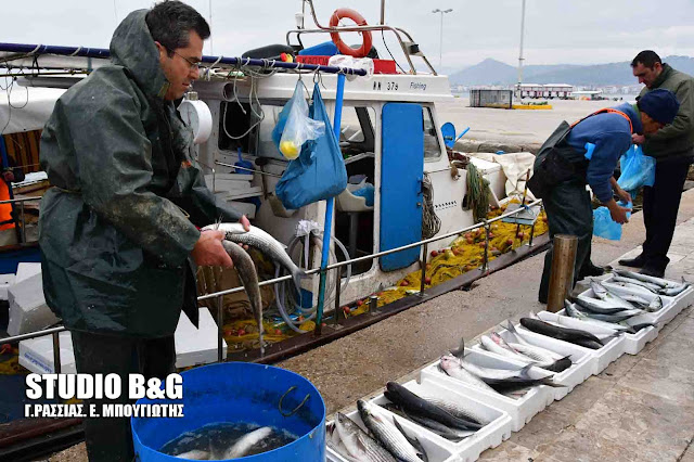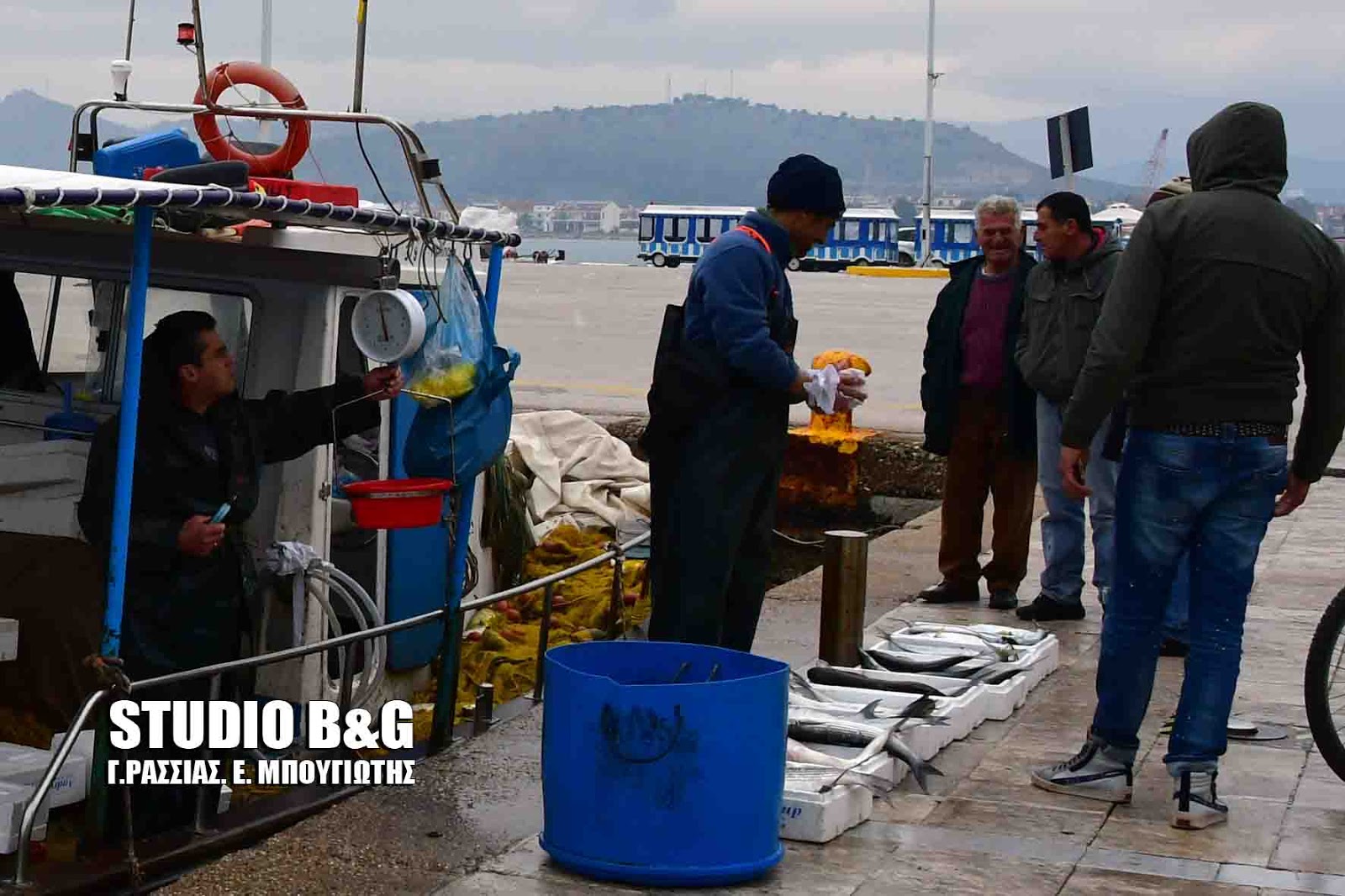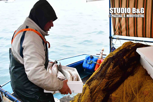 Το τσουχτερό κρύο δεν πτόησε τον ψαρά Στέλιο Λυμπέρη στο Ναύπλιο να βγει με τους συνεργάτες του από τις 3 την νύχτα ανοιχτά του Αργολικού κόλπου για το μεροκάματο.