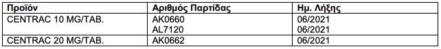Σε ανάκληση παρτίδων του φαρμακευτικού σκευάσματος CENTRAC 10mg/tab (κωδ. ΕΟΦ 1550801) και CENTRAC 20mg/tab (κωδ. ΕΟΦ 1550802) προχώρησε ο Εθνικός Οργανισμός Φαρμάκων (ΕΟΦ).