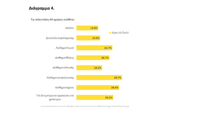 Κατά τη διάρκεια της απαγόρευσης της κυκλοφορίας οι συμμετέχοντες δήλωσαν σε μικρό ποσοστό ότι υπέφεραν από αϋπνία (13,8%) και αίσθημα κόπωσης (16,2%). Ταυτόχρονα ποσοστό 37,1% δηλώνει προβληματισμένο και 28,7% ότι νιώθει απογοήτευση. Ποσοστό 22,7% ένιωσε αίσθημα θυμού και 20,7% αίσθημα θλίψης.