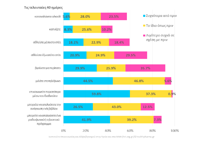 Οι Έλληνες σε ποσοστό 44,3% μιλούσαν πιο συχνά στο τηλέφωνο σε σχέση με πριν και 59,8% επικοινωνούσαν περισσότερο μέσω διαδικτύου σε σχέση με πριν. Τέλος ποσοστό 35,7% έβγαιναν για περίπατο λιγότερο συχνά σε σχέση με πριν.
