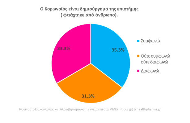 Ευάλωτοι είναι οι Έλληνες και στις θωρίες συνωμοσίας, καθώς όπως προκύπτει από τις απαντήσεις σε ποσοστό 35,3% πιστεύει πως ο κορωνοϊός φτιάχτηκε από άνθρωπο και 3 στους 10 πιστεύουν ότι δεν είναι δικαιολογημένη η αναστάτωση που έχει προκληθεί, αναφορικά με την προστασία της δημόσιας υγείας.