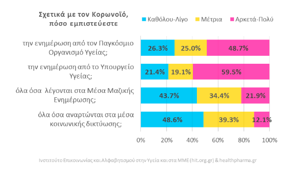 Ποσοστό 59,5% εμπιστεύεται πολύ έως απόλυτα την ενημέρωση του Υπουργείου Υγείας, ενώ μεγάλο είναι το ποσοστό των ανθρώπων που εμπιστεύονται και τον Παγκόσμιο Οργανισμό Υγείας.