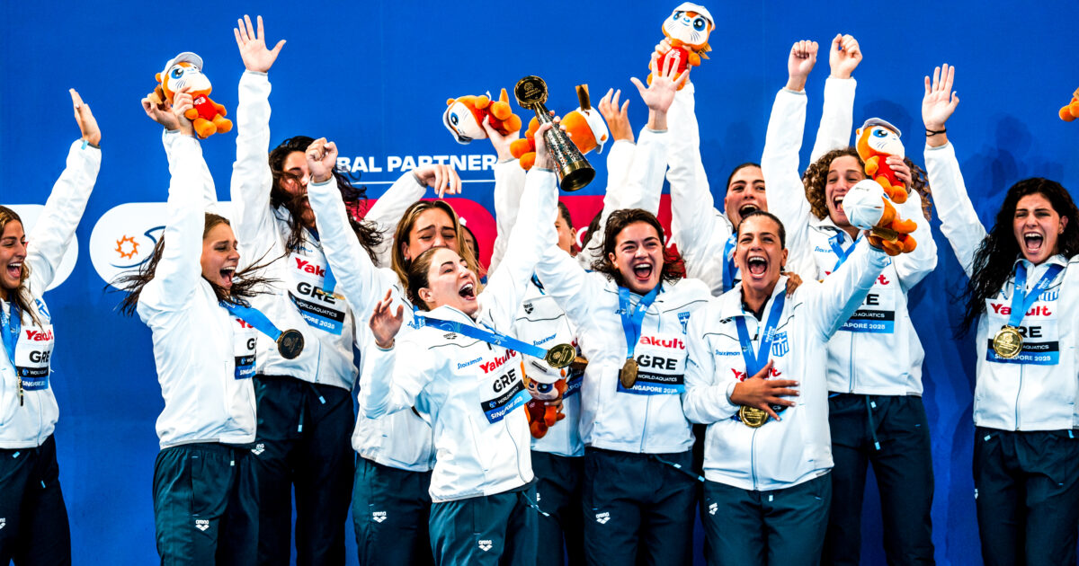 Λίγα λεπτά αργότερα, οι νέες παγκόσμιες πρωταθλήτριες του πόλο πήραν θέση στο υψηλότερο σκαλί του βάθρου, για την απονομή του τροπαίου και των χρυσών μεταλλίων που κατέκτησαν με το… σπαθί τους στη Σιγκαπούρη.