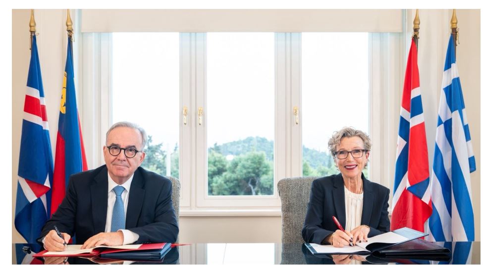 Υπεγράφη από τον αναπληρωτή υπουργό Εθνικής Οικονομίας και Οικονομικών Νίκο Παπαθανάση το Μνημόνιο Κατανόησης (MoU) μεταξύ της Ελλάδας και των τριών Δοτριών Χωρών (Νορβηγία, Ισλανδία, Λιχτενστάιν) που εξασφαλίζει νέους πόρους ύψους 143 εκατ. ευρώ για τη νέα προγραμματική περίοδο του Ευρωπαϊκού Οικονομικού Χώρου (EEA Grants) 2021-2028.