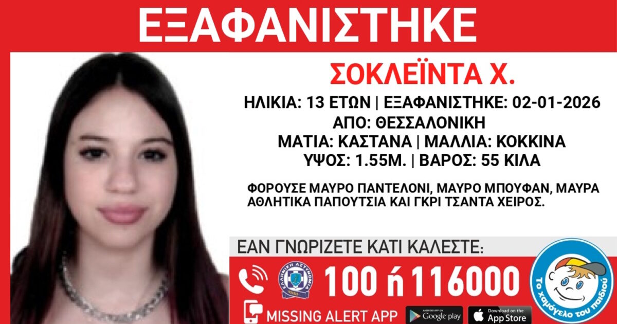 Σύμφωνα με το «Χαμόγελο του Παιδιού» στις 02/01/2026, βραδινές ώρες, εξαφανίστηκε από χώρο φιλοξενίας στη Θεσσαλονίκη η ανήλικη Σοκλέϊντα Χ., 13 ετών.