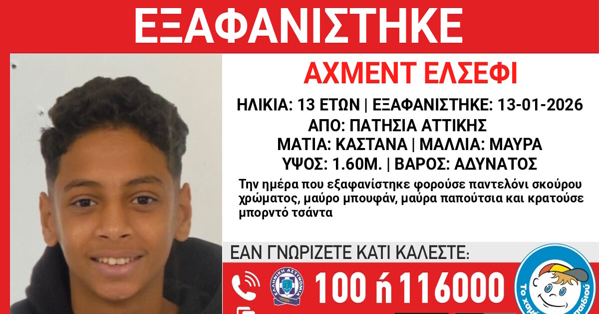 Την εξαφάνιση του Αχμέντ (ον) Ελσέφι (επ) 13 ετών, αιγυπτιακής καταγωγής, γνωστοποιεί το «Χαμόγελο του Παιδιού» με ανακοίνωσή του την Τετάρτη (14.01.2026).