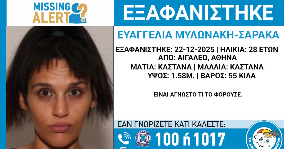 Για την εξαφάνιση της Ευαγγελίας Μυλωνάκη- Σαράκα, το «Χαμόγελο του Παιδιού» αναφέρει ότι η 28χρονη αγνοείται από στις 22/12/2025, από την περιοχή του Αιγάλεω.