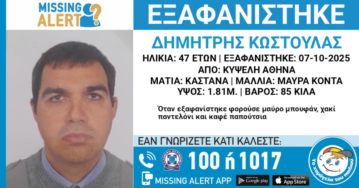 Σύμφωνα με το «Χαμόγελο του Παιδιού» για την εξαφάνιση, τα ίχνη του 47χρονου χάθηκαν από την Κυψέλη και προχώρησε στη δημοσιοποίηση των στοιχείων του, κατόπιν αιτήματος της οικογένειάς του, καθώς ενδέχεται να συντρέχουν λόγοι, οι οποίοι θέτουν τη ζωή του σε κίνδυνο. Αξίζει να σημειωθεί ότι για την εύρεσή του ενεργοποιήθηκε άμεσα η Ομάδα Έρευνας και Διάσωσης του Οργανισμού «Θανάσης Μακρής» και η Ομάδα Διαχείρισης Κρίσεων (Ο.ΔΙ.Κ.).