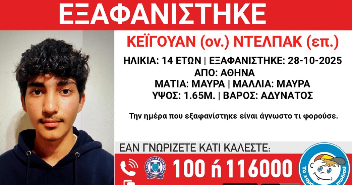Όπως αναφέρει η ανακοίνωση από το «Χαμόγελο του Παιδιού» το απόγευμα της 28ης Οκτωβρίου εξαφανίστηκε από δομή φιλοξενίας στην περιοχή της Αθήνας, ο Κέϊγουαν (ον.) Ντελπάκ (επ.), ηλικίας 14 ετών, ιρανικής