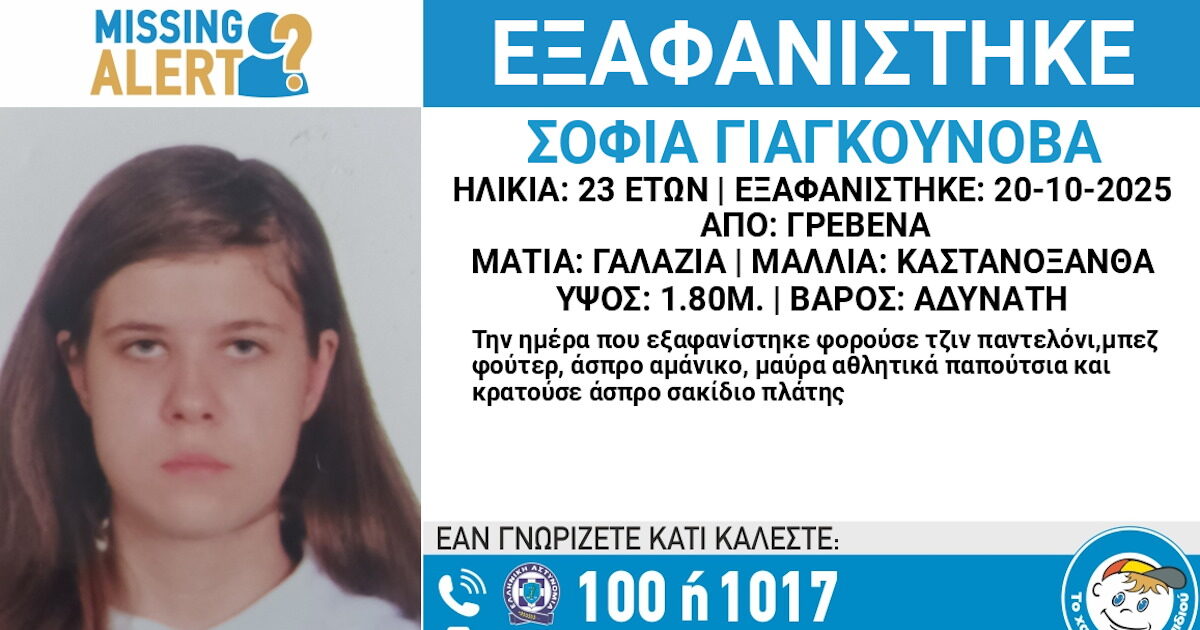 Το «Χαμόγελο του Παιδιού» εξέδωσε ανακοίνωση με την οποία ζητά πληροφορίες για την εξαφάνιση της 23χρονης Σοφίας Γιαγκούνοβα που χάθηκε στα Γρεβενά στις 20/10/25 το πρωί.