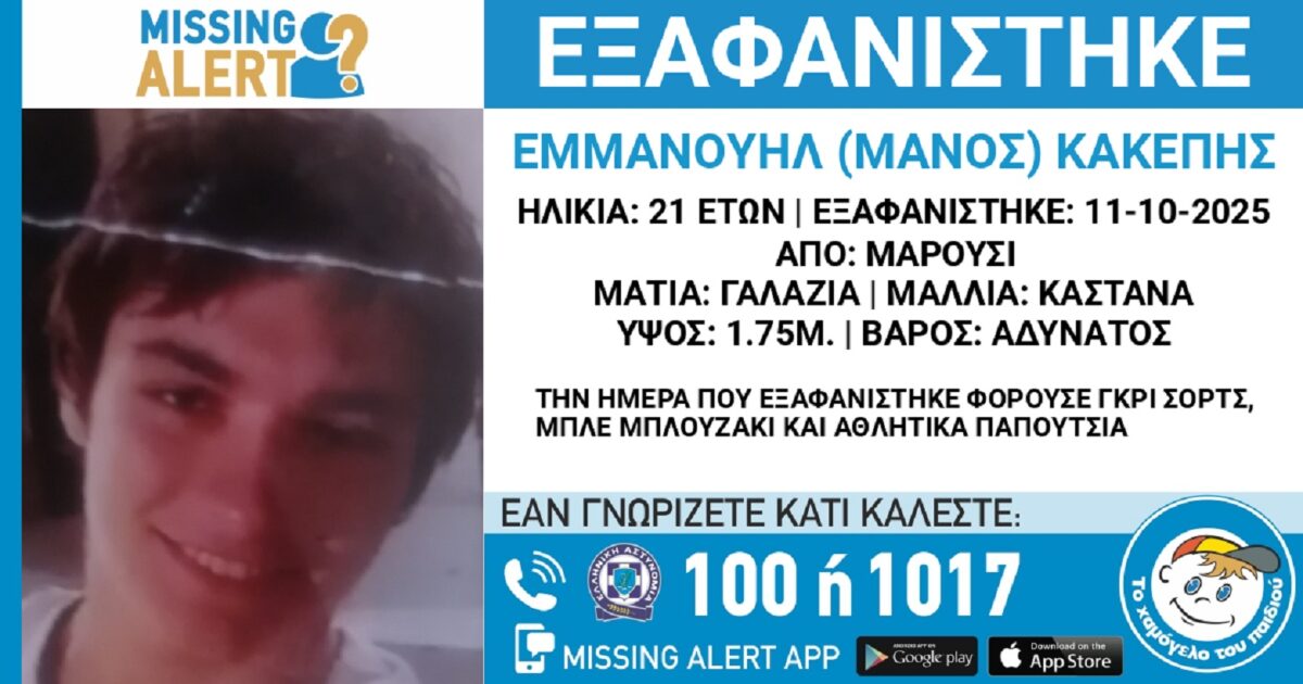 Συγκεκριμένα ο 21χρονος Εμμανουήλ (Μάνος) Κακέπης εξαφανίστηκε στις 11 Οκτωβρίου από το Μαρούσι ενώ το «Χαμόγελο του Παιδιού» ενημερώθηκε σήμερα 13 Οκτωβρίου για την εξαφάνιση και προχώρησε στη δημοσιοποίηση των στοιχείων του ενήλικα.